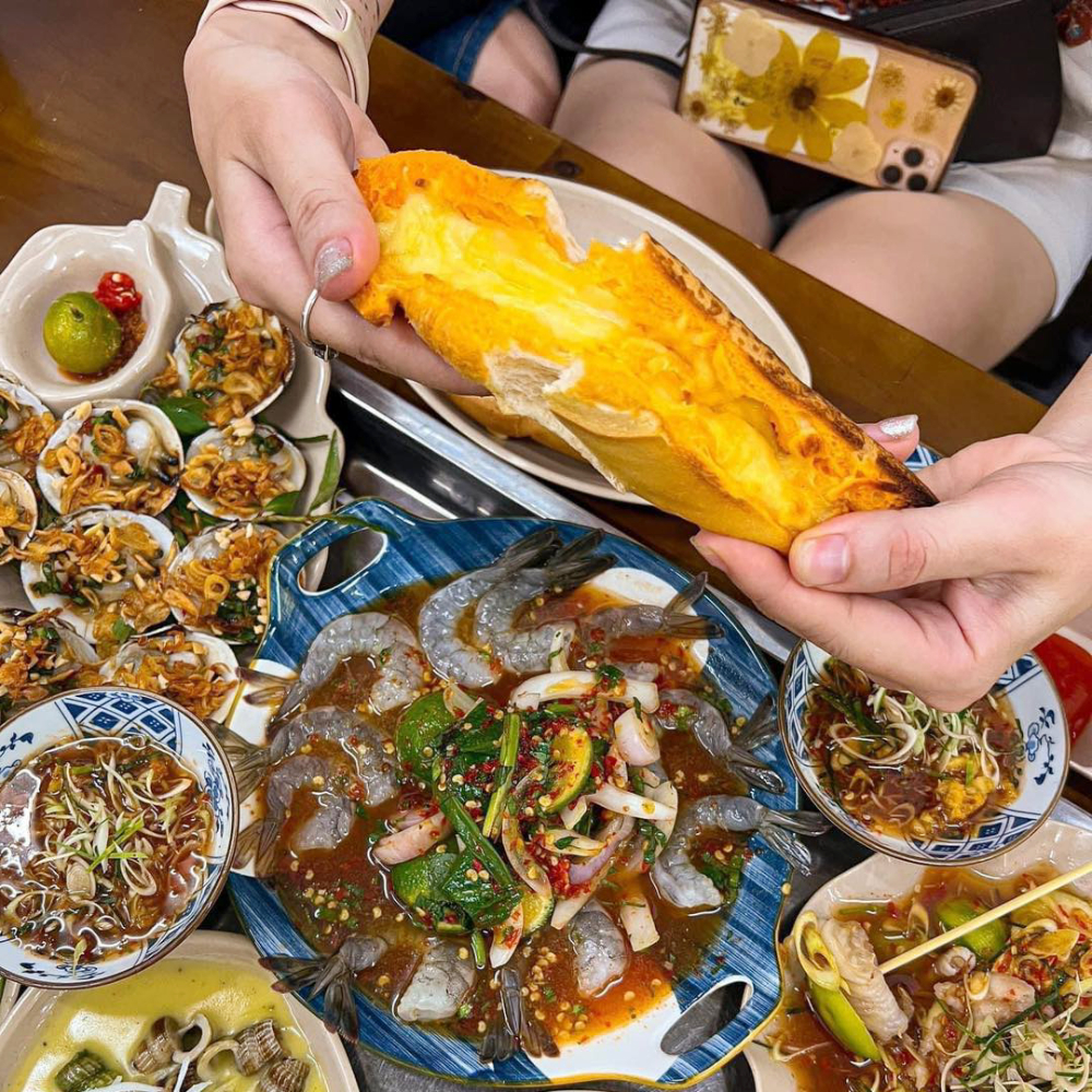 Hãy thử bẻ một miếng bánh mì giòn rụm, quệt thật đẫm vào phần sốt trứng muối hoàng kim béo ngậy, sốt bơ tỏi cay nồng, hay nước sốt me chua ngọt sánh mịn của các món ốc. Phần ruột xốp mềm sẽ hút trọn vẹn tinh hoa đậm đà của nước sốt, mang đến một dư vị bùng nổ, kéo dài đến tận miếng cuối cùng.