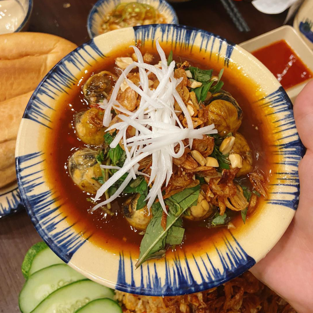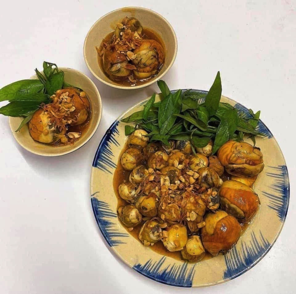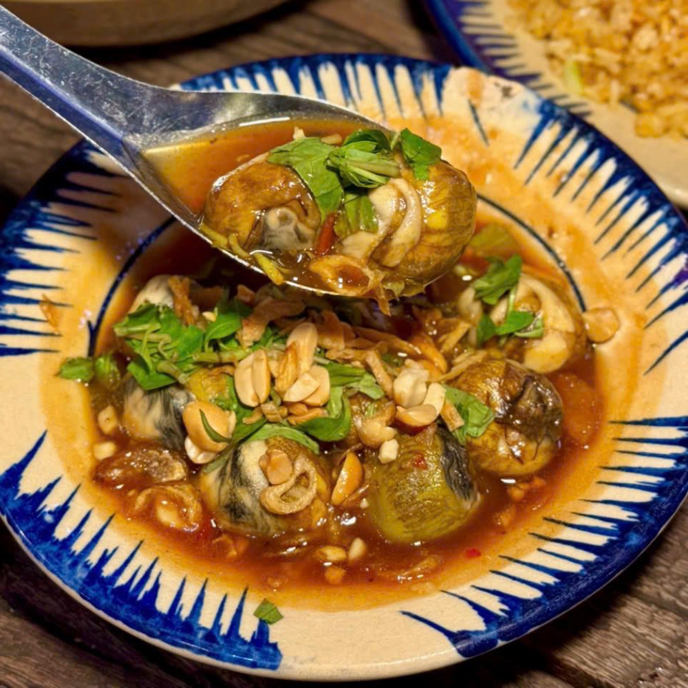 Topping giòn thơm: Phủ lên trên là lớp đậu phộng rang giòn rụm, hành phi vàng ươm thơm lừng và chút rau răm cay nồng đặc trưng, giúp cân bằng hoàn hảo độ béo của trứng.